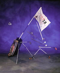 ![]() | Each mobile or stabile creation is an individual story of frustration on the golf course. The Downward spiral is when we make a bad shot decision, based on a previous bad shot decision, because of a previous bad decision until we break and throw every club in our bag. |
